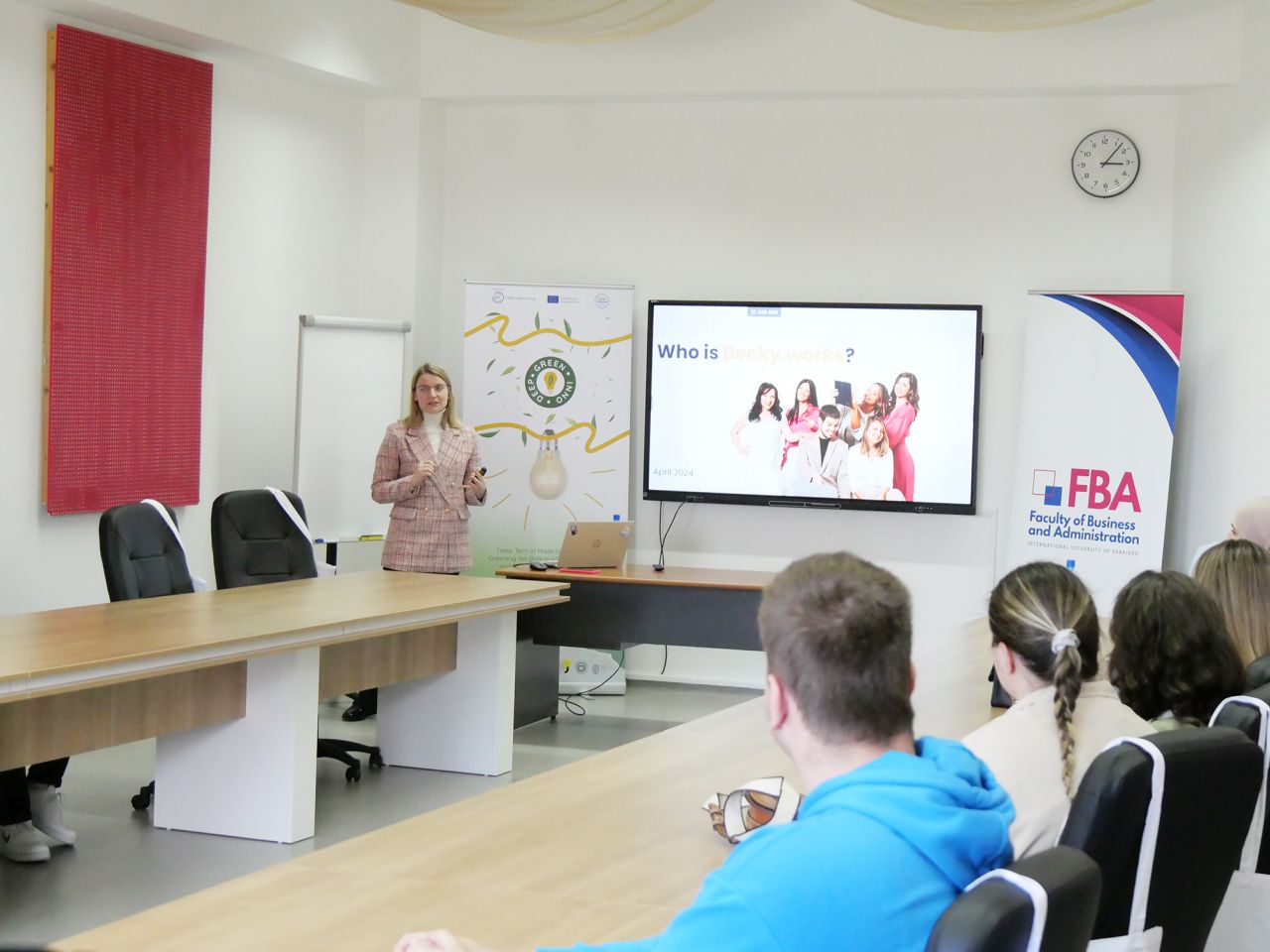 Doç Dr. Azra Ahmić ve Yrd Doç Dr. Šejma Aydin, finans, muhasebe veya denetime ilgi duyan orta ve son sınıf öğrencilerine hitap eden Emlak Piyasası dersinin bir parçası olarak bu konferansı düzenlemiştir. Derste Becky.works'ün derinlemesine sunumu, muhasebe ve finans üzerine tartışmalar ve etkili bir CV hazırlama, LinkedIn'i kullanma ve iş görüşmelerinde başarılı olma gibi olumlu iş başvuruları için temel ipuçları yer almıştır. Ayrıca Becky.works temsilcileri dağıttıkları hediyelerle katılımcıları memnun ederek bu eğitici etkinliğe unutulmaz bir dokunuş katmıştır. Bu ilgi çekici oturum sadece Becky.works'ün işleyişi ve tarihçesine derinlemesine bir bakış sunmakla kalmamış, aynı zamanda öğrencilere paha biçilmez bir rehberlik sağlayarak onları işgücüne daha yatkın olmaları için hazırlamıştır.